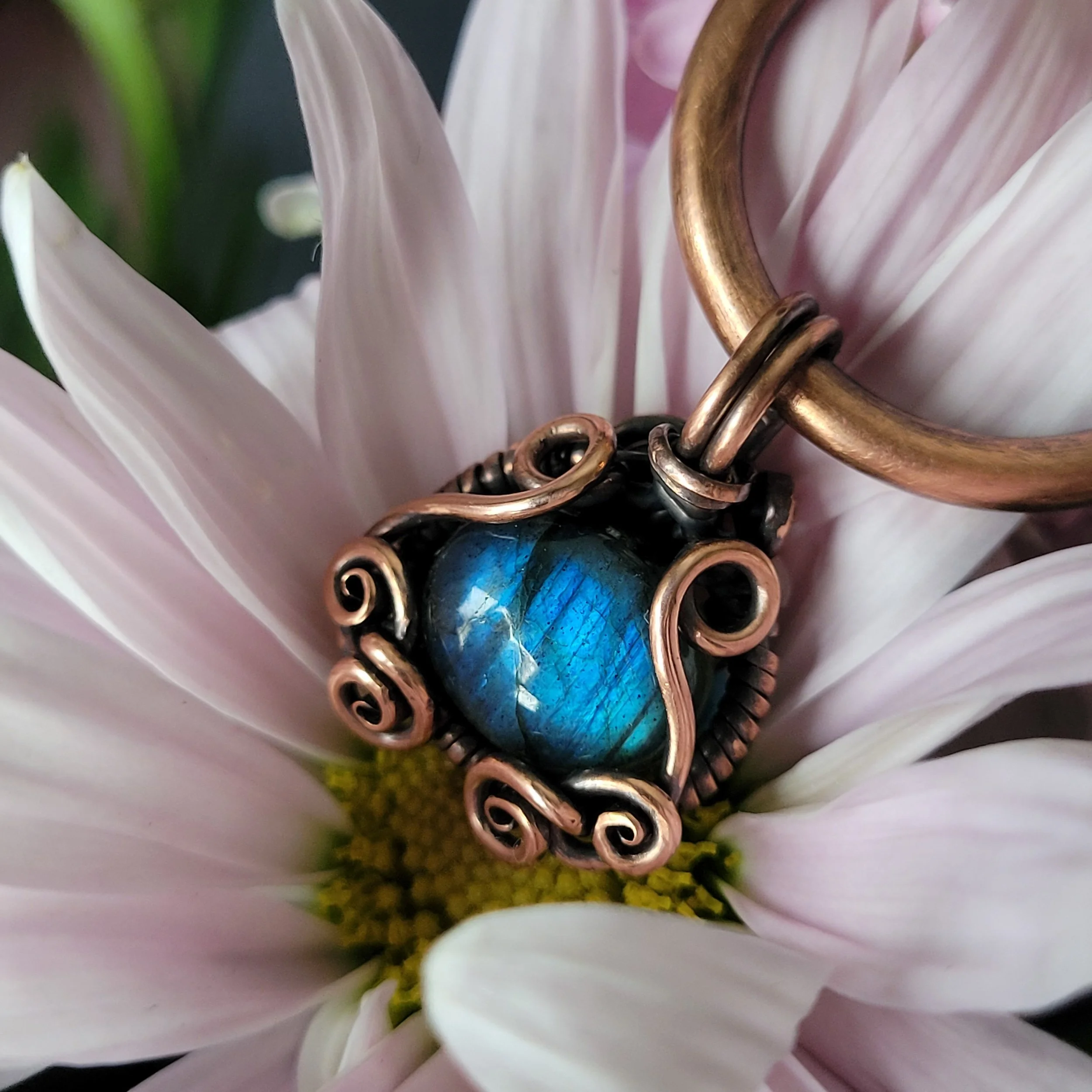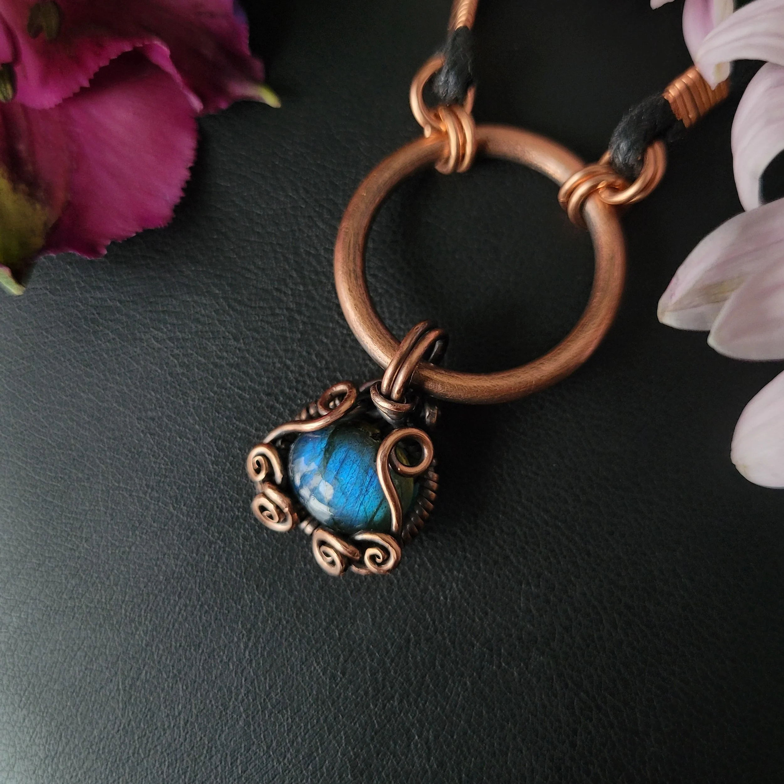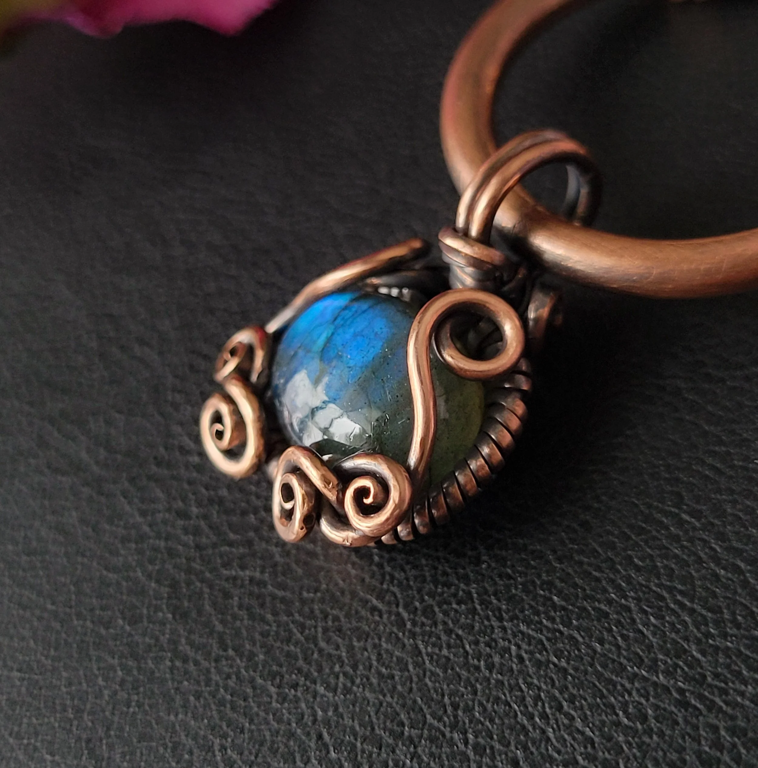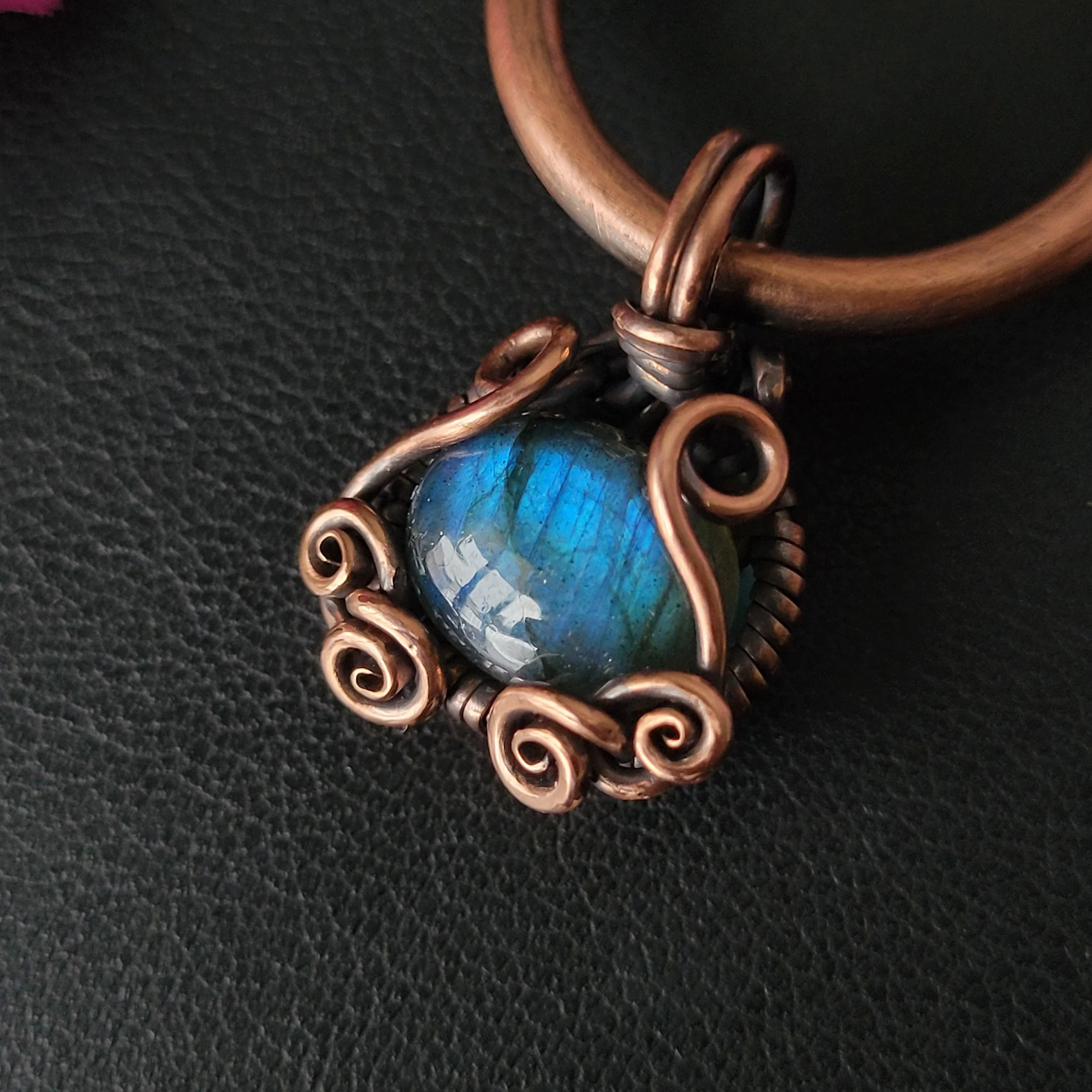 Labradorite wrapped in copper.
