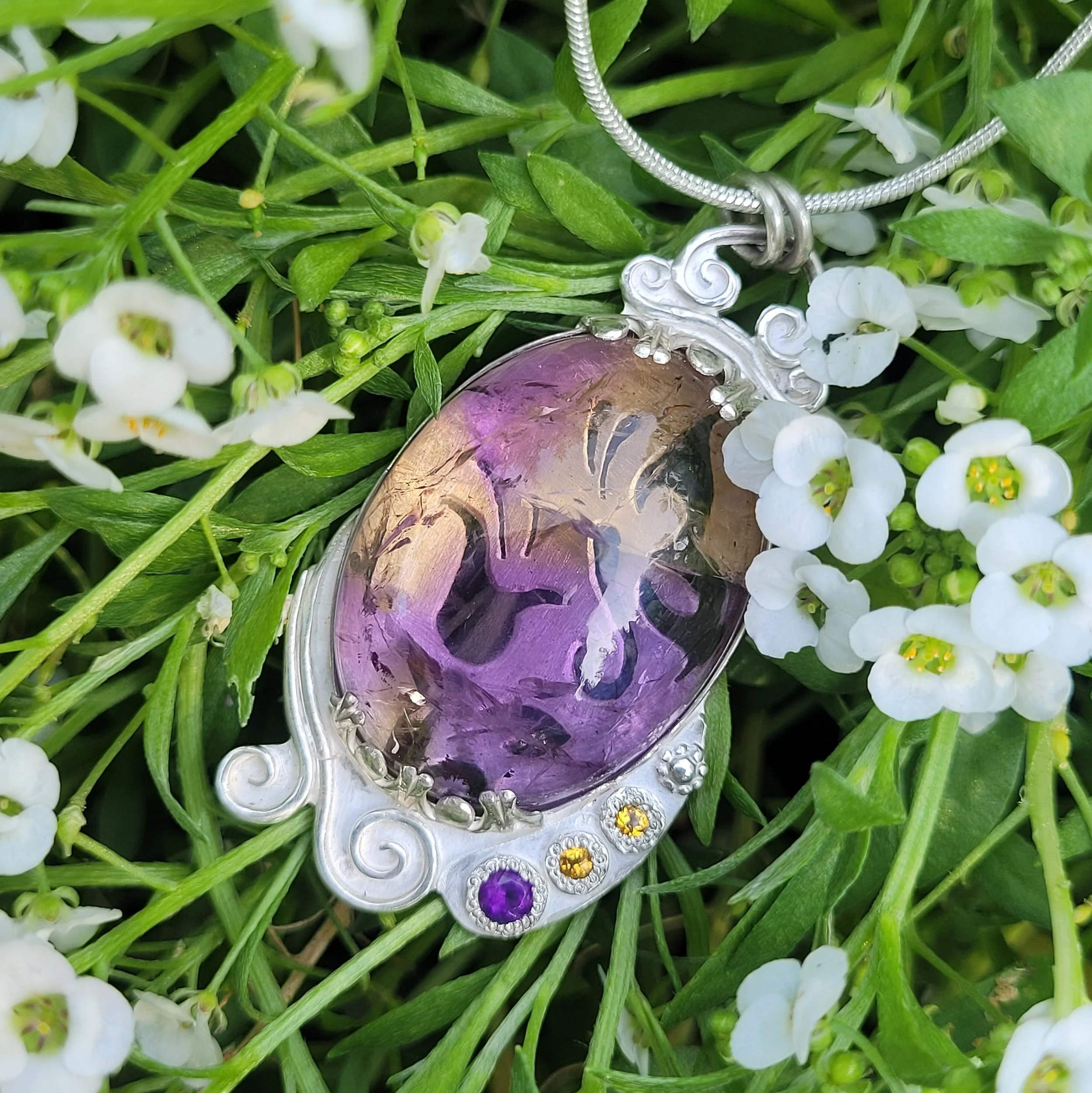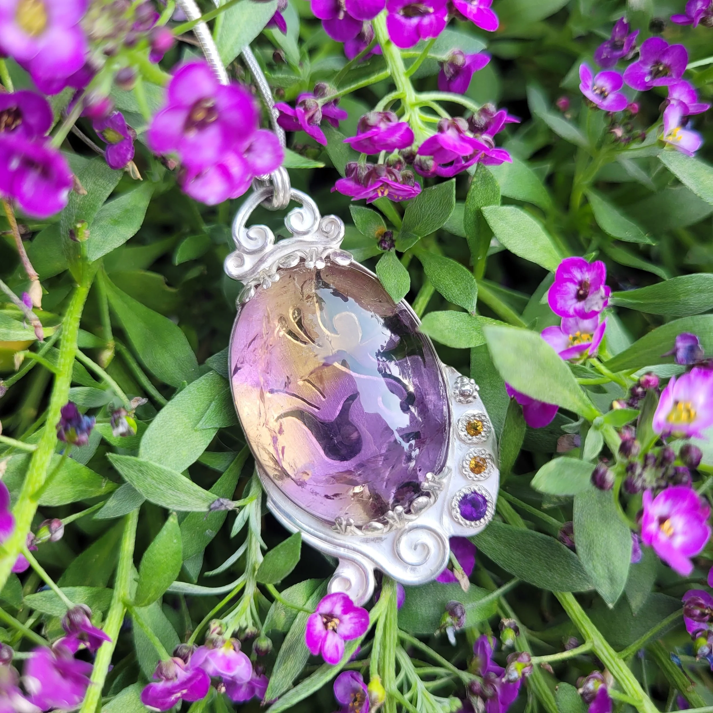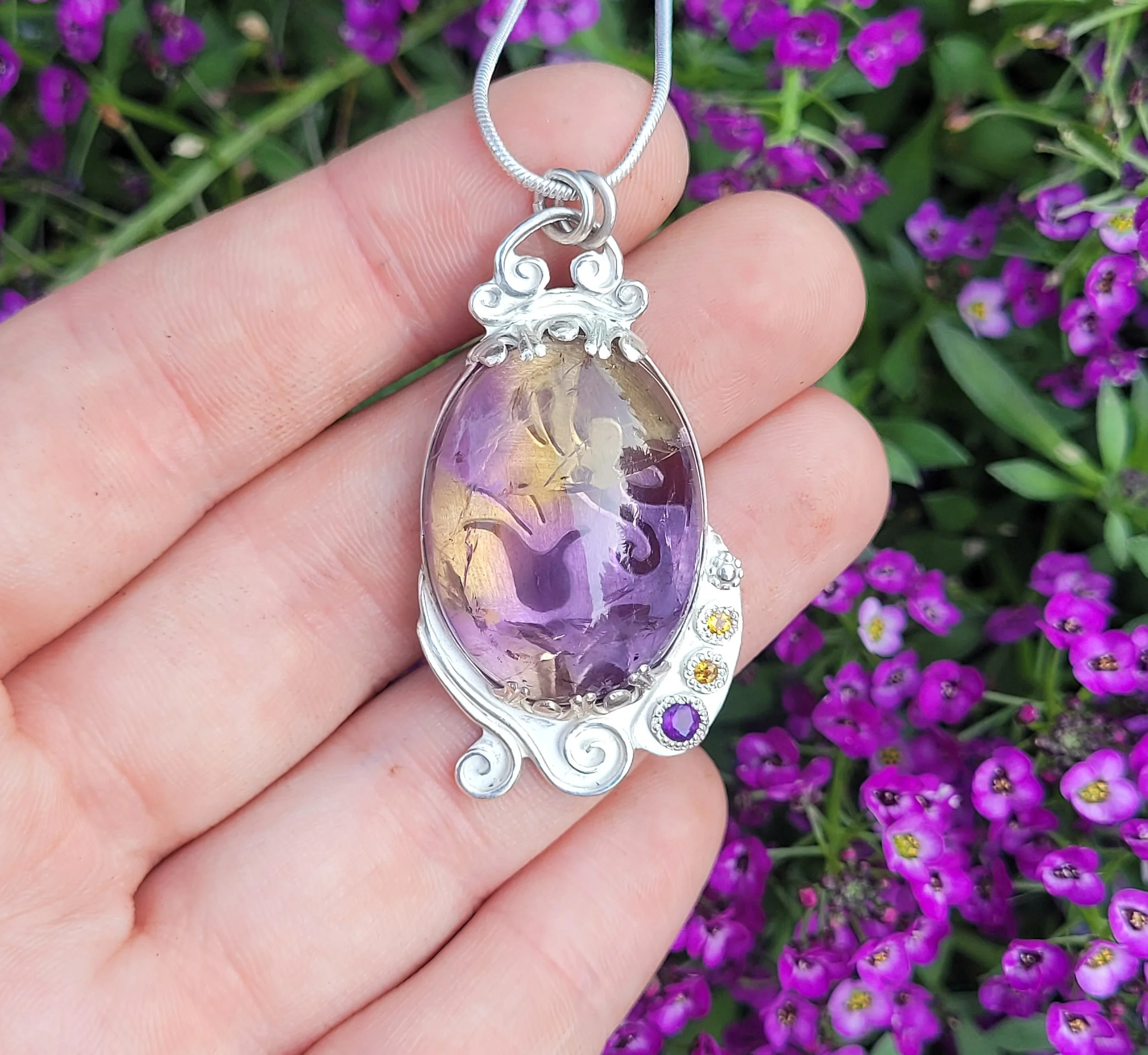 This necklaces unique design was crafted by forging solid sterling wire to encase ametrine, amethyst and citrine. On the backplate I cut out a pretty butterfly landing on a flower design to let the shine through.