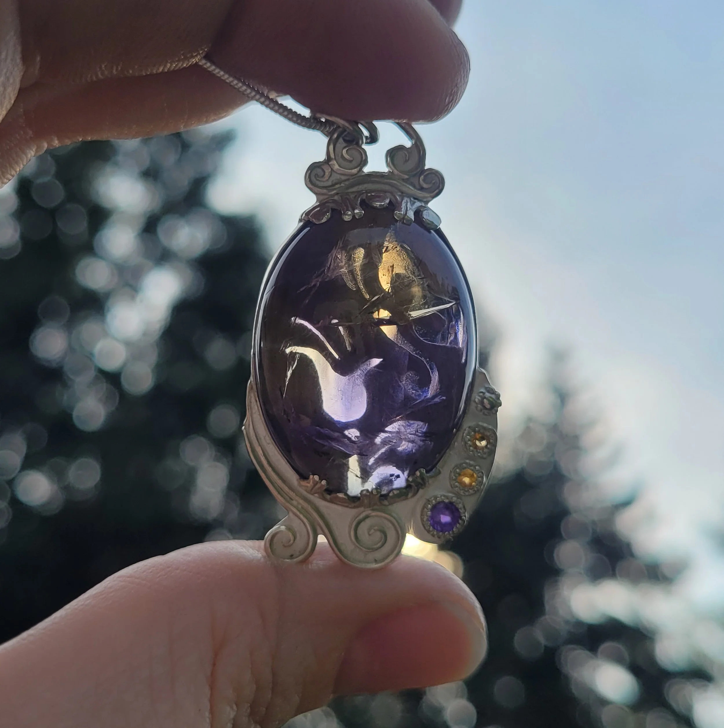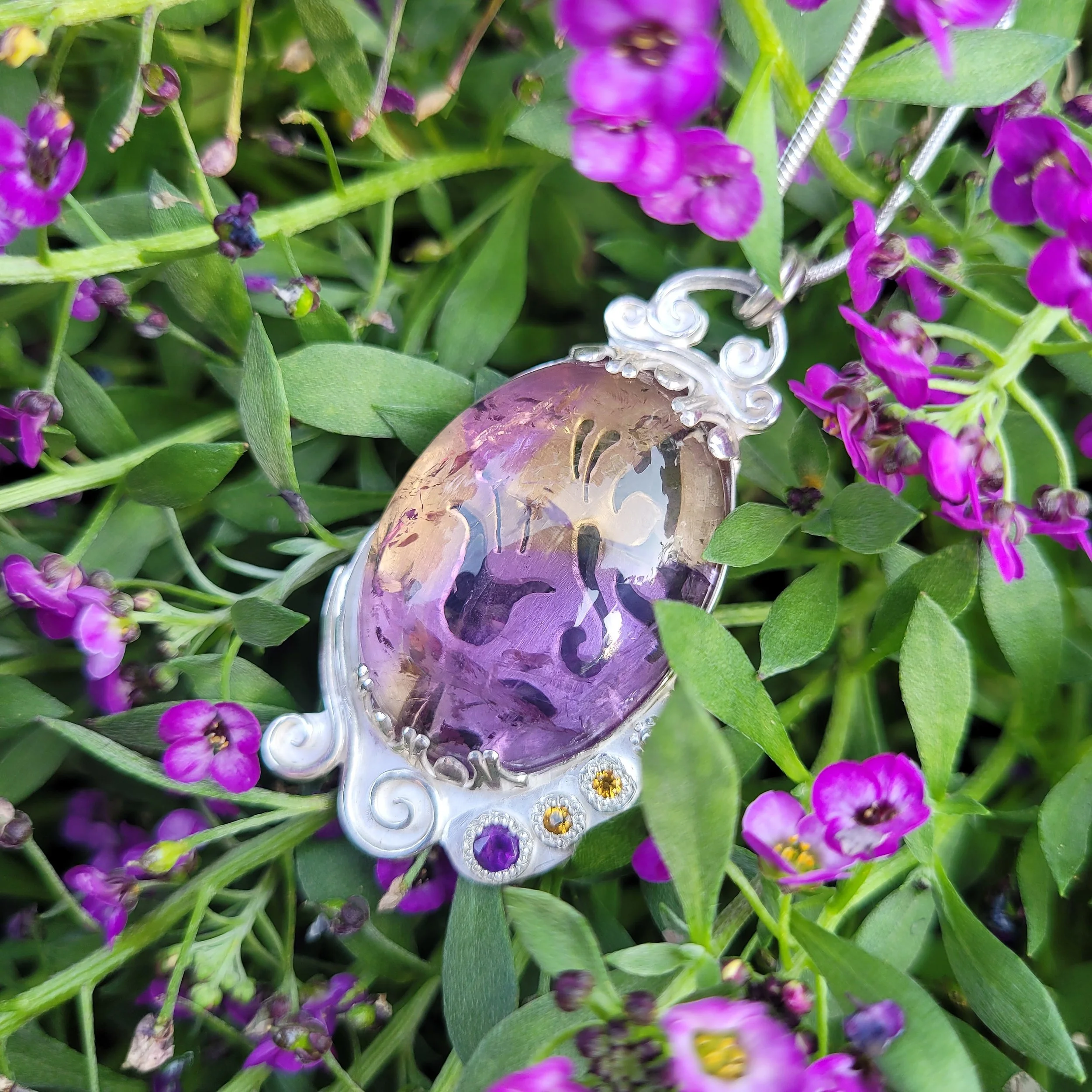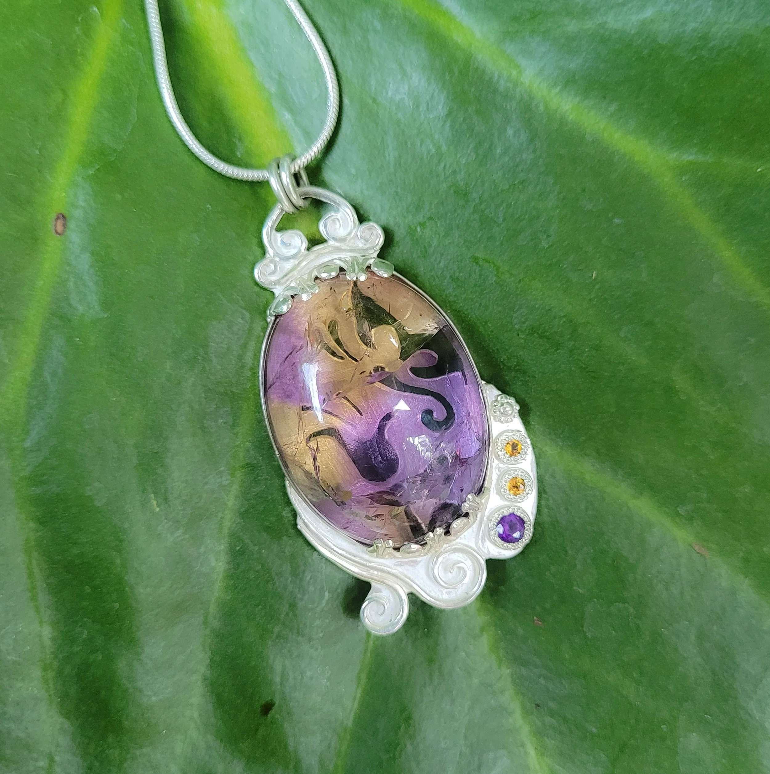 This necklaces unique design was crafted by forging solid sterling wire to encase ametrine, amethyst and citrine. On the backplate I cut out a pretty butterfly landing on a flower design to let the shine through.