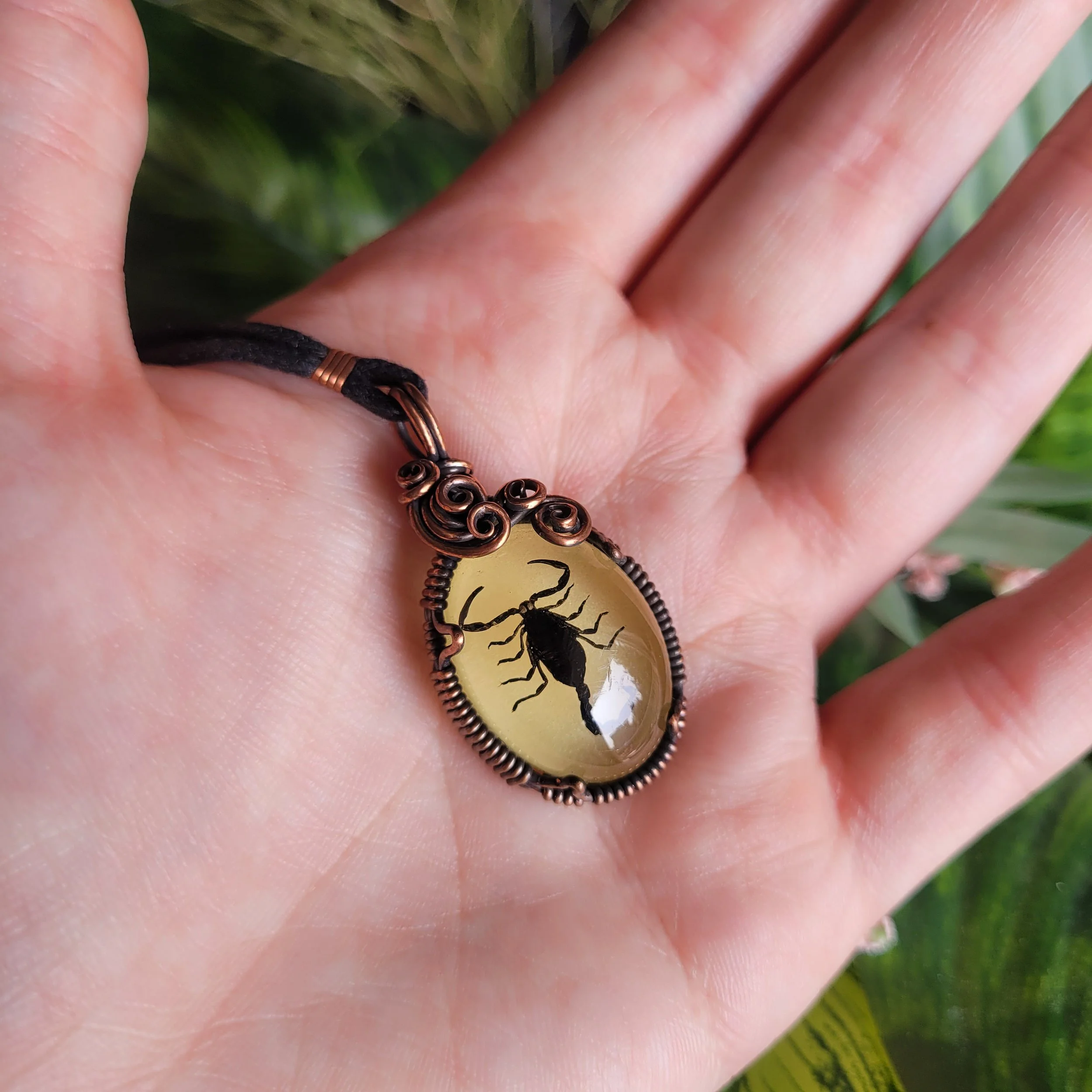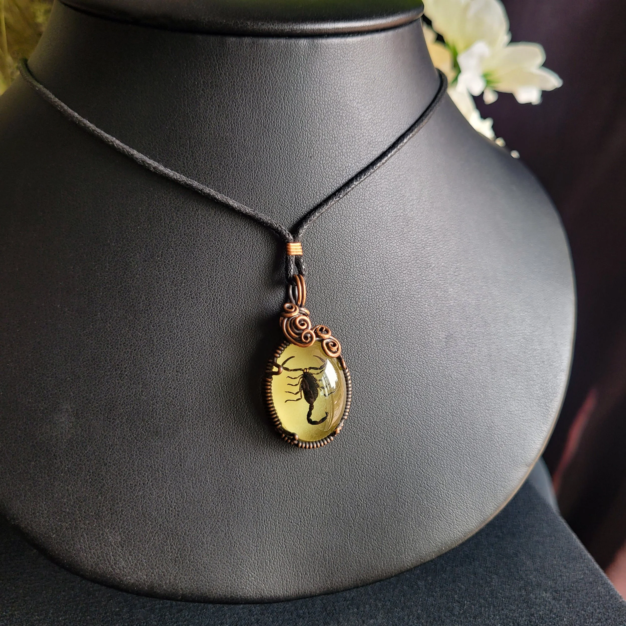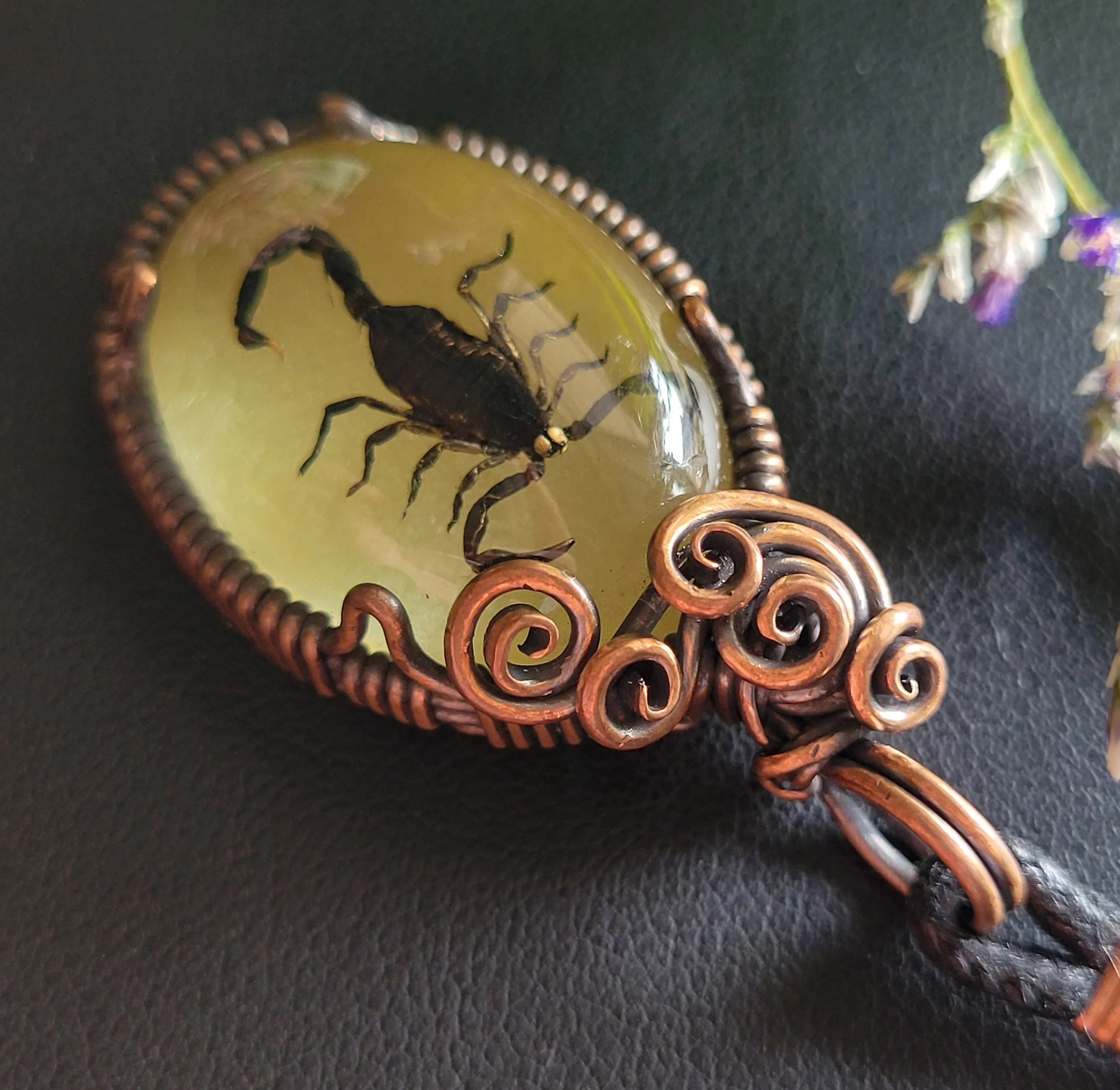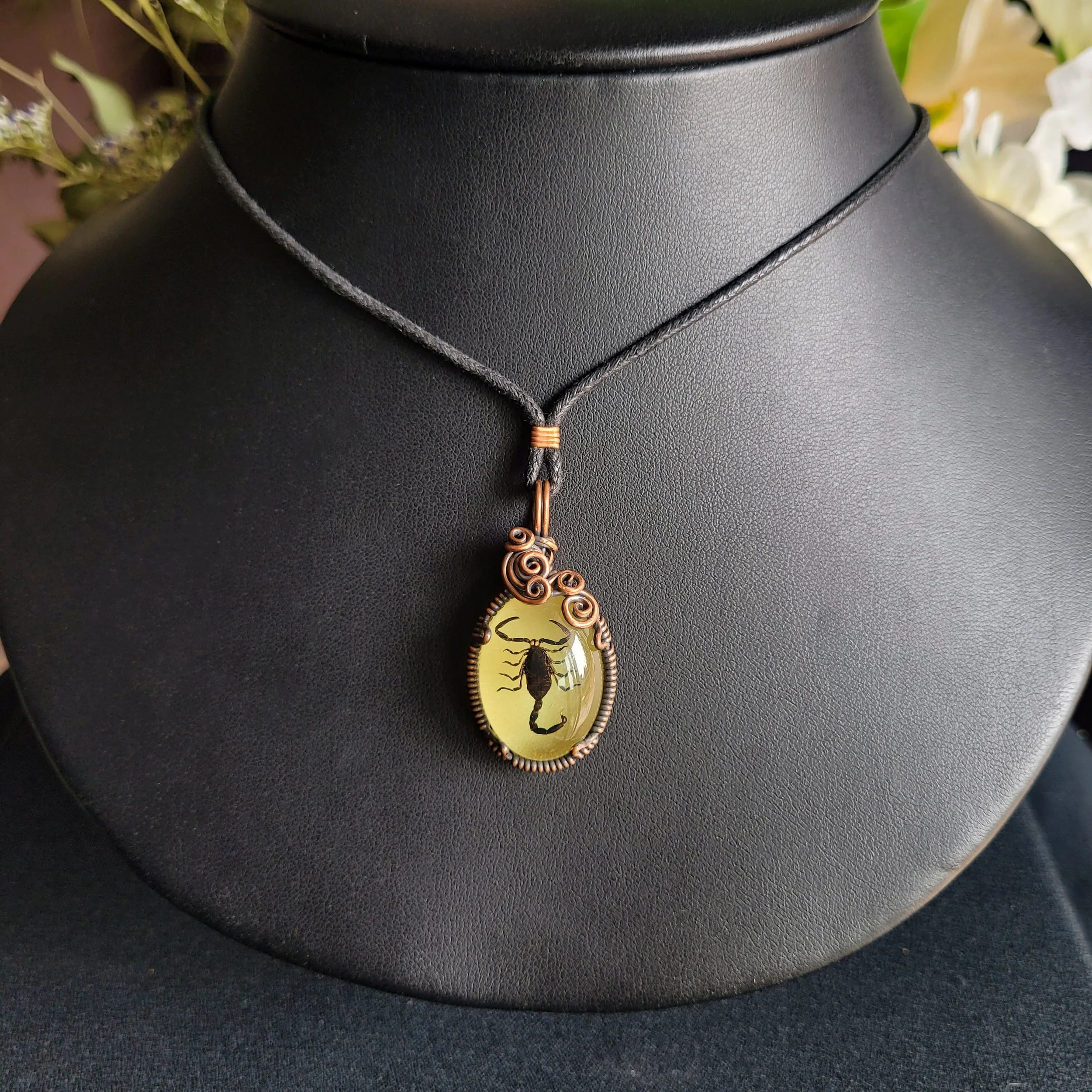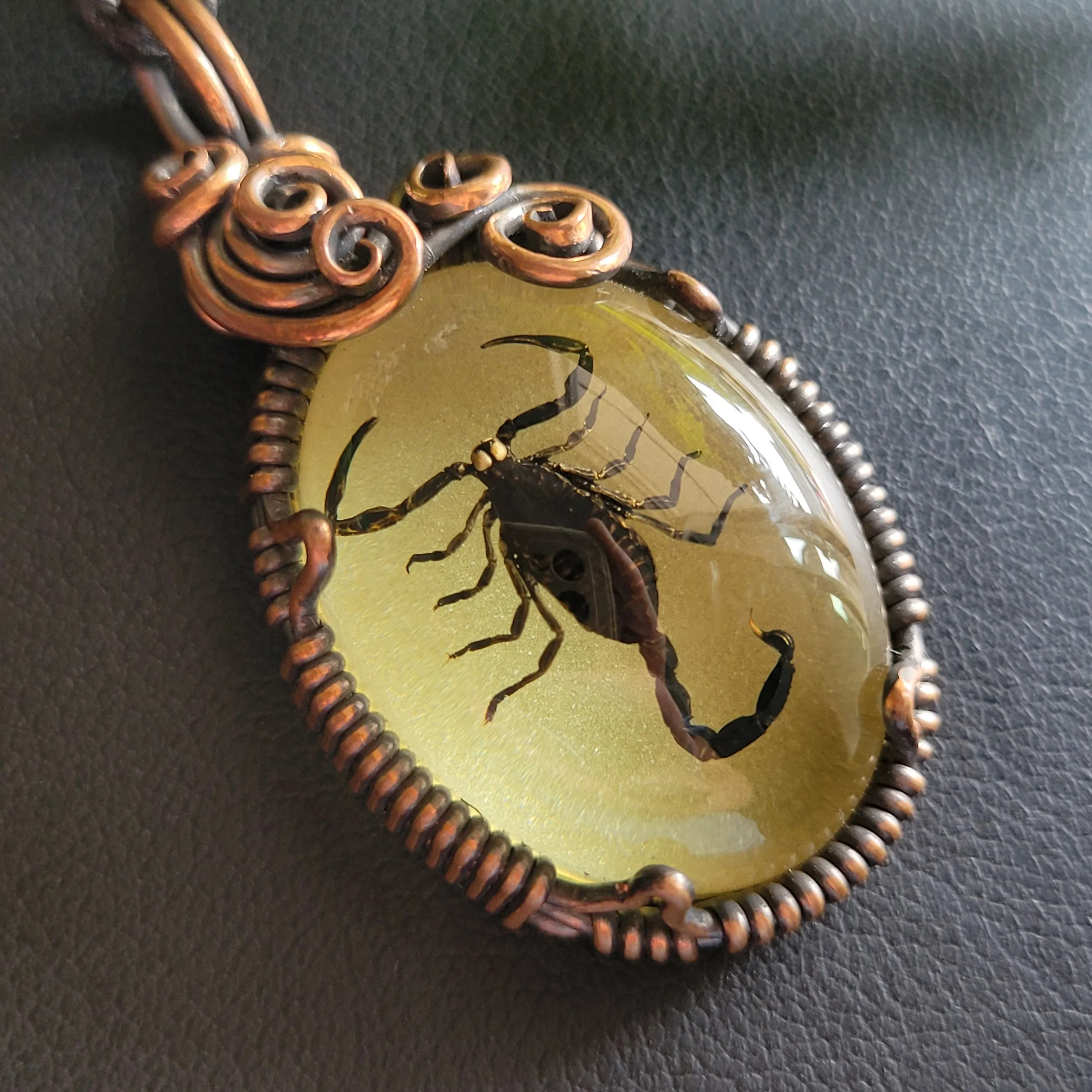 This pendant’s unique design was handcrafted by weaving and hammering copper wire around a genuine Scorpion encased in glow in the dark epoxy resin.