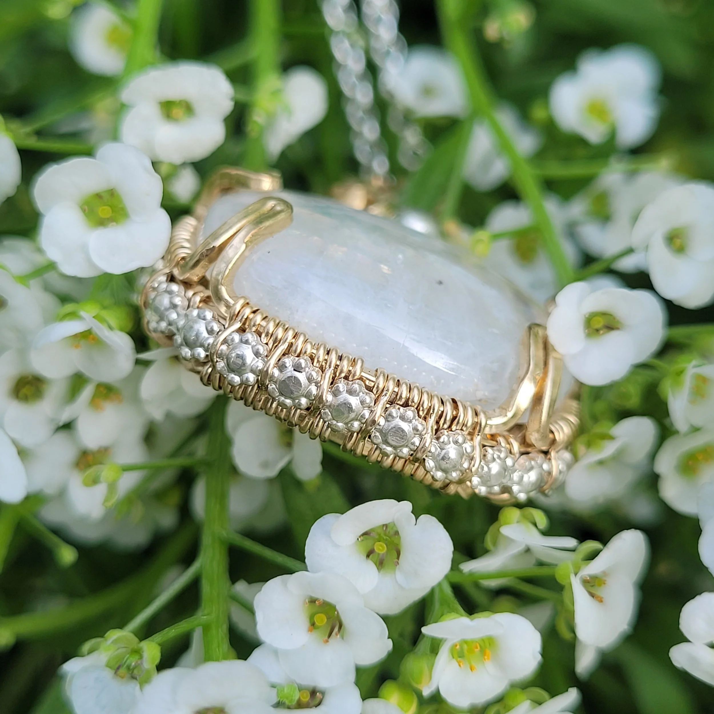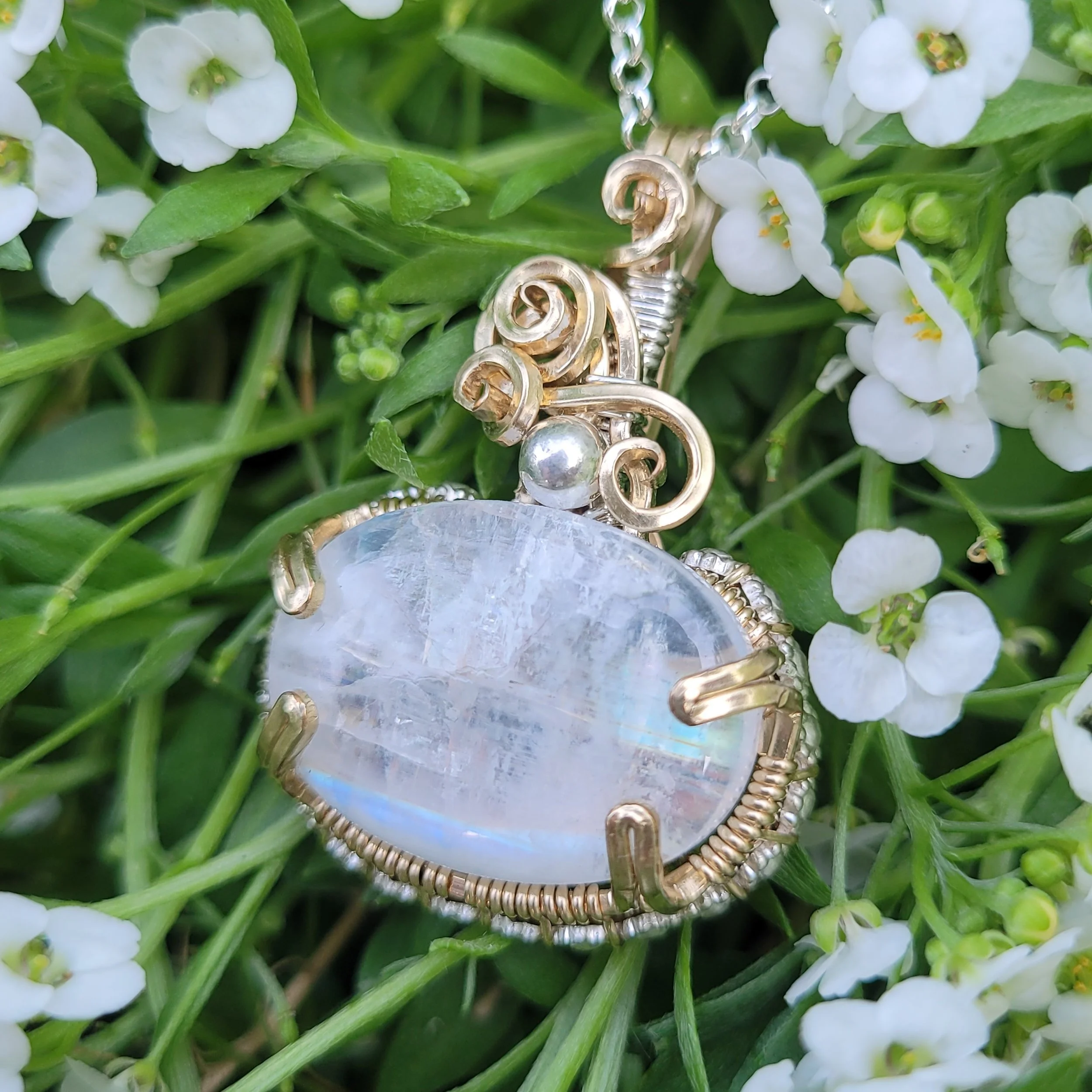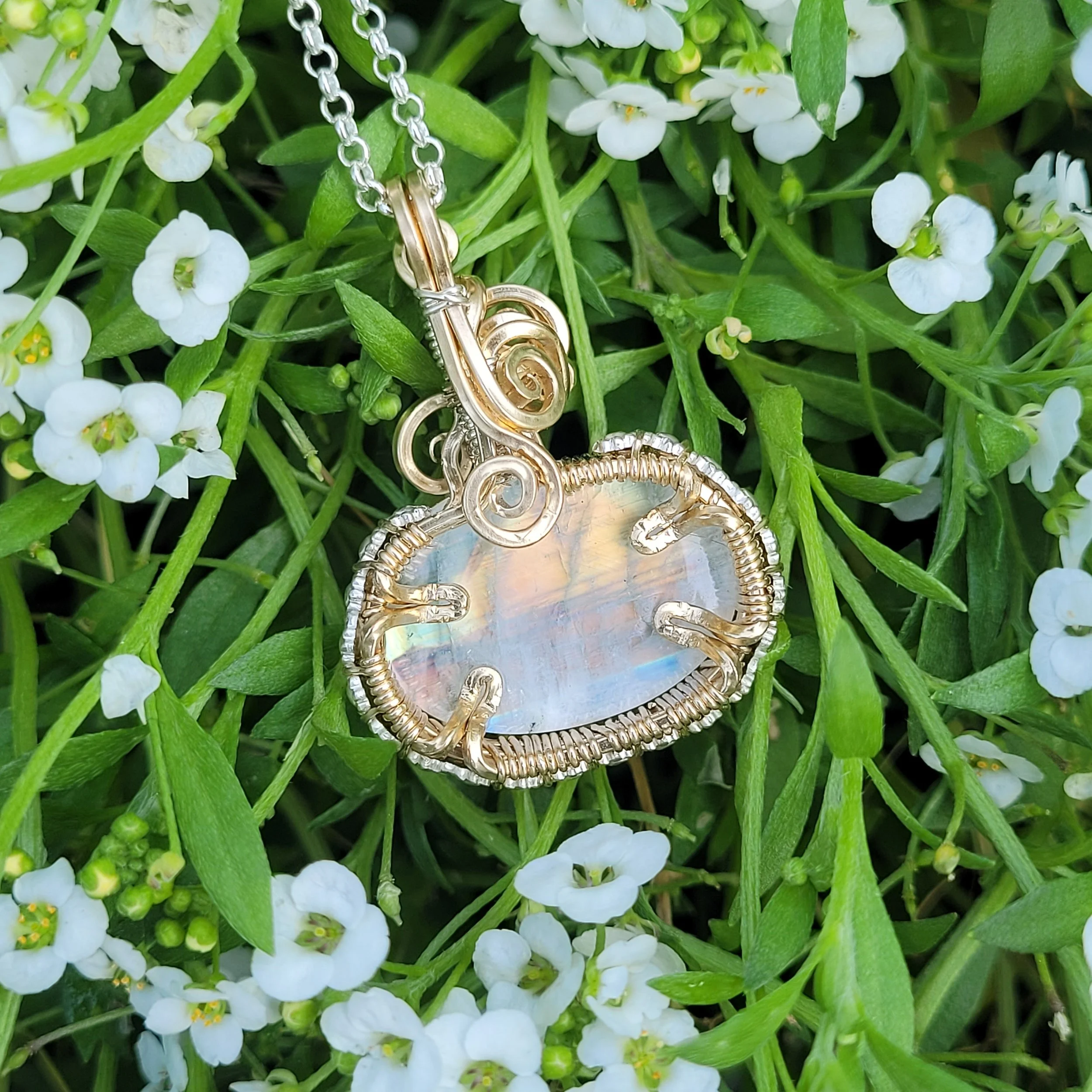 Rainbow moonstone set in 14k gold filled wire and solid 925 sterling silver wire.